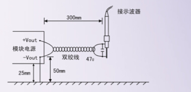 輸出紋波和噪聲是指疊加在輸出直流上交流成份,其中紋波是疊加在輸出直流上開關(guān)頻率的諧波分量,而噪聲電 壓是與開關(guān)頻率無關(guān)的非周期的分量。測試紋波和噪聲應(yīng)在規(guī)定的帶寬內(nèi)測試,一般用20MHZ帶寬,超20MHZ帶寬 的示波器可選用20MHZ帶寬限制,噪聲、紋波測試一般用mVp-p表示,測量時應(yīng)采用摸擬示波器選擇適當(dāng)?shù)牧砍?,?描速度應(yīng)低干0.5秒,測峰-峰值雜音電壓,接線如圖